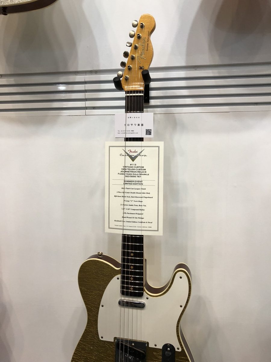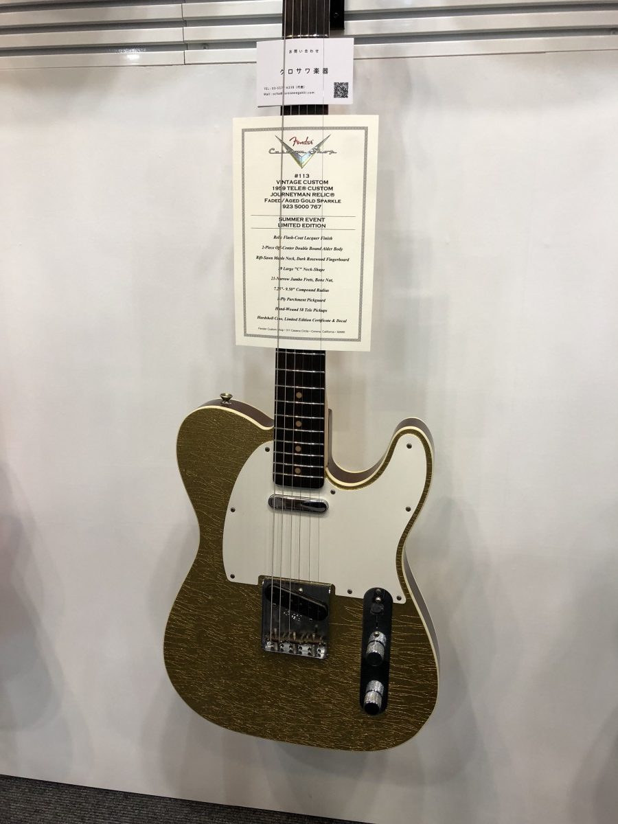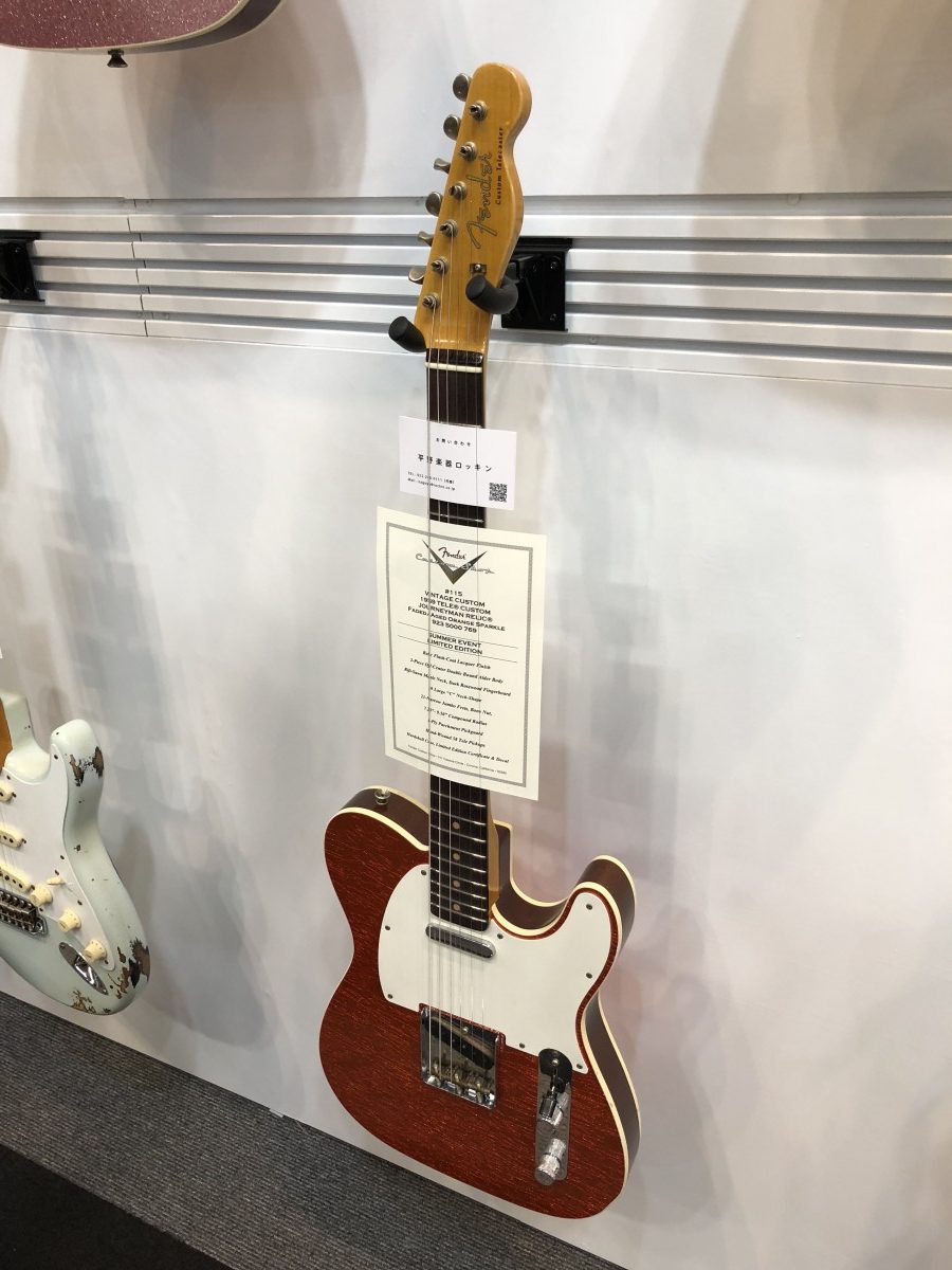 Custom Telecasterで滅多に見かけないレアなラメ入りスパークルが色々な色で展示されていました。とにかくカッコいいです。